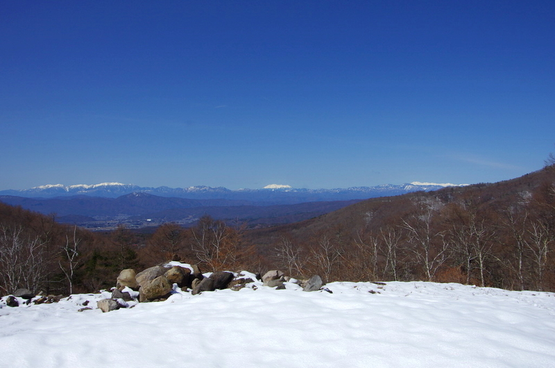八ヶ岳、南ア、中央ア、御岳、乗鞍、北アの五竜岳まで視界が広がります。雪山風景はやっぱりいいです。