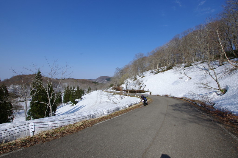 長野・新潟県境となる深坂峠に到着。新潟側の道路はまだ雪の下でした。